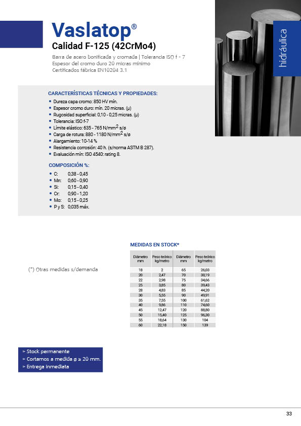 CARACTERÍSTICAS TÉCNICAS ACERO AL CARBONO PARA HIDRÁULICA VASLATOP: