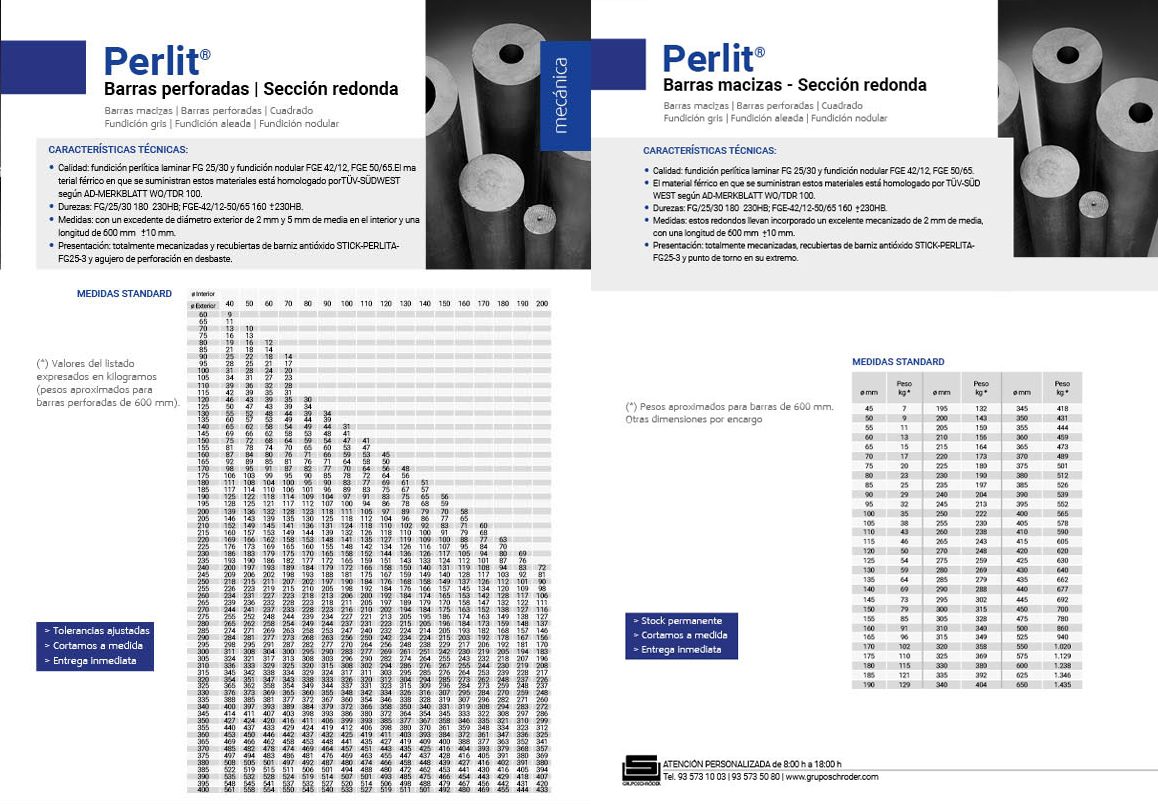 - Presentación: totalmente mecanizadas y recubiertas de barniz antióxido STICK-PERLITA-FG25-3 y agujero de perforación en desbaste.